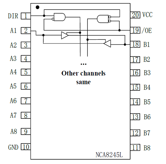 NCA8245L是一款八通道缓冲器/驱动器,用于提高面向总线的接收器和发射器、时钟驱动等的驱动能力。并确保信号时钟的准确性。该器件提供方向控制 (DIR) 输入,用于双向传输数据。当DIR为逻辑高电平时,它将数据从A传输到B,当DIR为低电平时,它将数据从B传输到A。当 /OE 为高电平时,输出处于高阻抗状态。在上电和掉电期间,应通过上拉电阻将/OE连接到VCC,以确保高阻抗状态。NCA8245L可承受高达5.5V的输入电压,每个通道支持最大24 mA电流驱动。所有未使用的输入必须保持在VCC或GND,以防止电源电流过大。