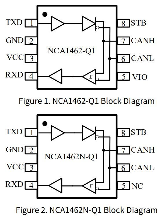 NCA1462-Q1 is a high-speed CAN transceiver with Normal and Standby modes and a VIO supply pin. It meets the physical layer requirements of the ISO 11898-2-2016 high speed CAN specification and meets the CiA 601-4 Signal Improvement Capability (SIC) specification, and is fully interoperable with high-speed Classical CAN and CAN FD transceivers. The CAN signal improvements significantly reduce signal ringing on the network, allowing reliable CAN FD communication at 5 Mbit/s in larger topologies. In addition, the NCA1462 has a much tighter bit timing symmetry, enabling CAN FD communication up to 8 Mbit/s. The NCA1462 is intended as a simple replacement for high-speed Classical CAN and CAN FD transceivers, such as the NCA1042.