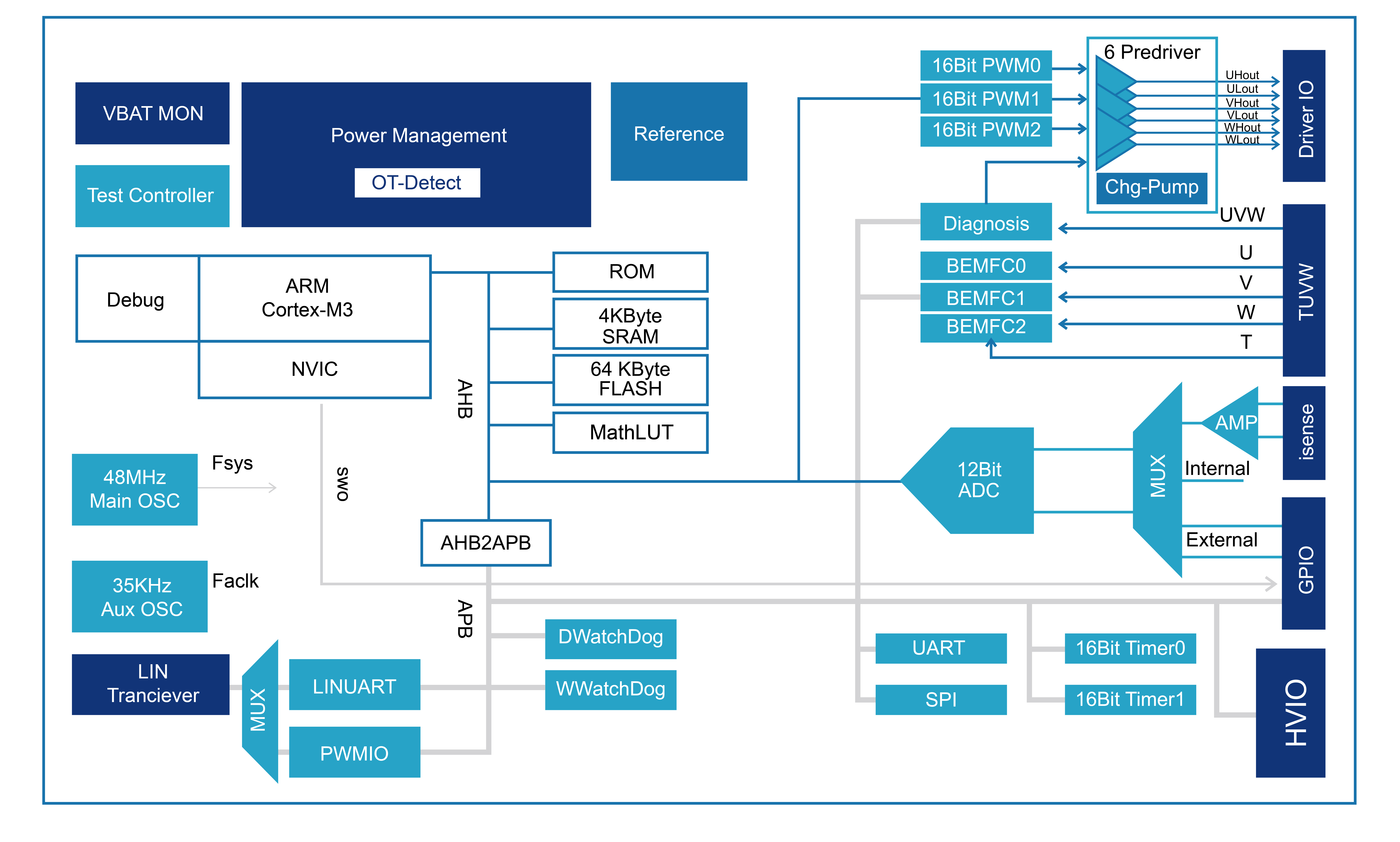 NOVOSENSE announced the launch of NSUC1602, a high-integration embedded motor control IC, following its introduction of NSUC1610, a small motor driver SoC for automotive applications in early 2023. Compared to the single-chip NSUC1610 that integrates LIN and MOS power stages, NSUC1602 as a SoC, supports an external independent power MOSFET design. This innovative approach enables it to effortlessly address applications requiring higher current.