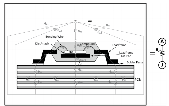 In the figure, the heat is transferred from the junction up through the package body to the top of the package case, and the sum of the thermal resistances between them is denoted as θJC(top). In addition, the heat is transferred from the junction down through the adhesive, the leadframe die pad, to the bottom thermal pad and the entire PCB, with the sum of the thermal resistances denoted by θJB. Also, the unified thermal resistance of all the heat from the junction to the external environment in all directions for all materials and structures is denoted as θJA.