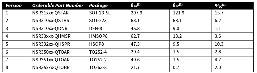 For NSR31/33/35 series LDOs, there are 8 packages, the specific information is shown in the table 2. Various types of thermal resistances of different packages have been indicated in the thermal resistance matrix of the chip datasheet. The information is summarized as follows.