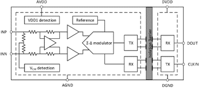 模拟输入经过放大,并由二阶Σ-Δ调制器连续采样,然后转换为高速,单比特数据流。输出数据与外部时钟同步,时钟下降沿有效,频率范围为5MHz至21MHz。通过使用适当的数字滤波器(例如sinc3滤波器)来抽取比特流,该器件可以在78.125KPS的条件下以20MHz的主时钟实现16位分辨率和86dB/82.5dB信噪比(SNR)。故障安全功能包括输入共模过压检测和VDD1缺失检测,简化了系统设计和诊断。
