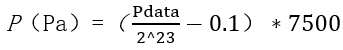 若0x06、0x07、0x08寄存器的值分别为0x15、0x55、0x56,按照上述步骤,D1=1398102,该D1值小于8388607,则Pdata=1398102,P(Pa)= 500,最终得到压力值为500Pa;