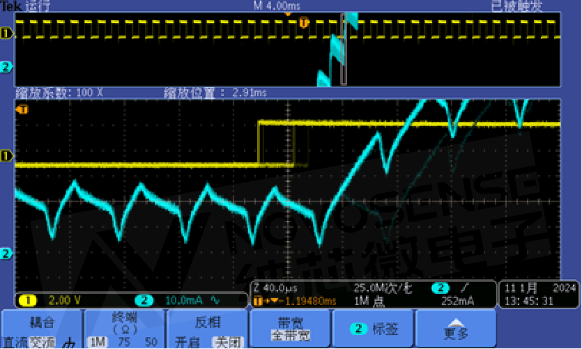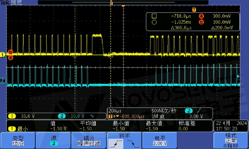步进电机1:2kHz step频率,20kHz调制频率,正常转动时之间的OUTA1,OUTA2的反电势为3.2V,如图11。堵转时OUTA1、OUTA2之间的反电势为0.2V,如图12。