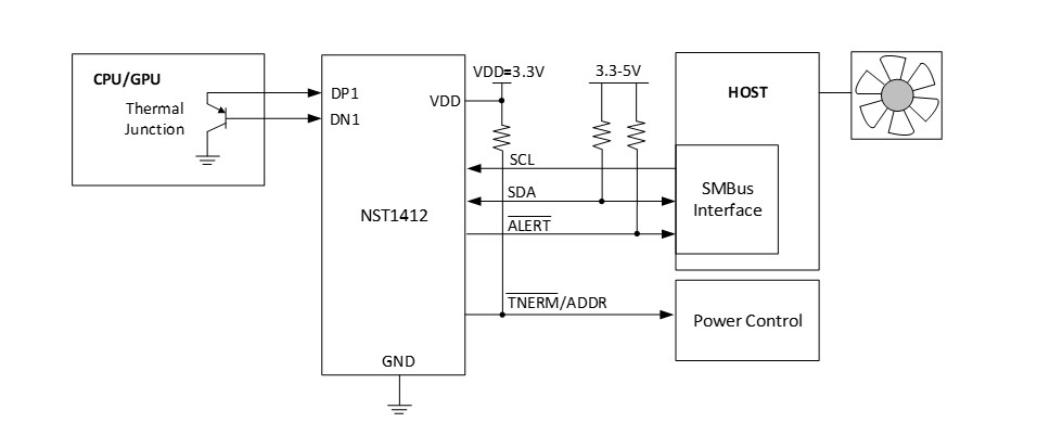 NST1412是具有内置本地温度传感器的远程温度传感器监视器。其远程温度传感器连接的晶体管通常是低成本的NPN或PNP类型晶体管或二极管,这些器件是微控制器、微处理器或FPGA必不可少的组成部分。对于本地和远程温度传感器,片上11bit的模数转换提供高达0.125℃的分辨率。NST141x两线串行接口可兼容I2C和 SMBus™的接口,多达六个不同的引脚可编程地址。此外NST141x集成了串联电阻消除、可编程非理想因子(η因子)、可编程的偏移量、可编程温度的限值、可编程数字滤波器、二极管故障检测和温度报警等个性化功能,提高了精度和抗噪性,实现了可靠的热监测解决方案。NST141x的工作电压范围为3 V至3.6 V,温度范围为-40℃至125℃,是通信、计算、仪表和工业等众多应用中多位置、高精度温度测量的理想选择。其中NST1412支持一路本地和一路远程的温度监测。